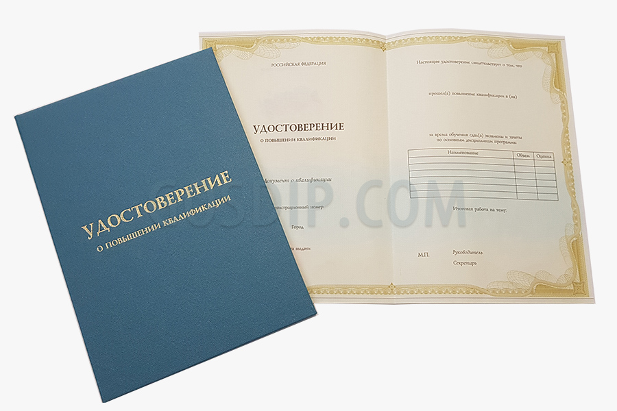 На нашем сайте Вы можете купить удостоверение по повышении квалификации в любой сфере (кроме медицины), которое свидетельствует о том, что специалист прошёл курс повышения своих знаний и навыков в рамках имеющейся профессии, полученной по основному высшему или среднему профессиональному образованию. Обращайтесь, сделаем качественно, быстро, доставим по Санкт-Петербургу курьером уже на следующий день.